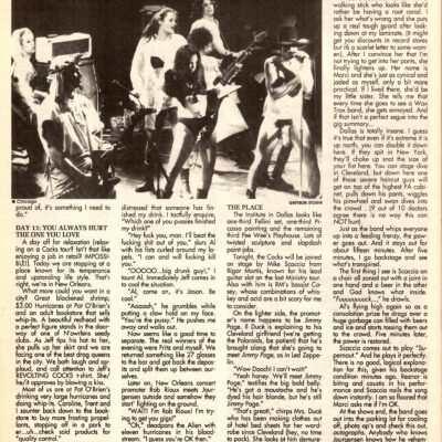 Finally in Cleveland. Brian’s van is threatening to quit. So are some crew members. Alex isn’t into the REVCO thang of dancers and stage divers, and Lee isn’t too pleased with vans with melting engines. This may never be resolved. (Some COCKS vow to quit if there is no bus in Cleveland. Sure.)