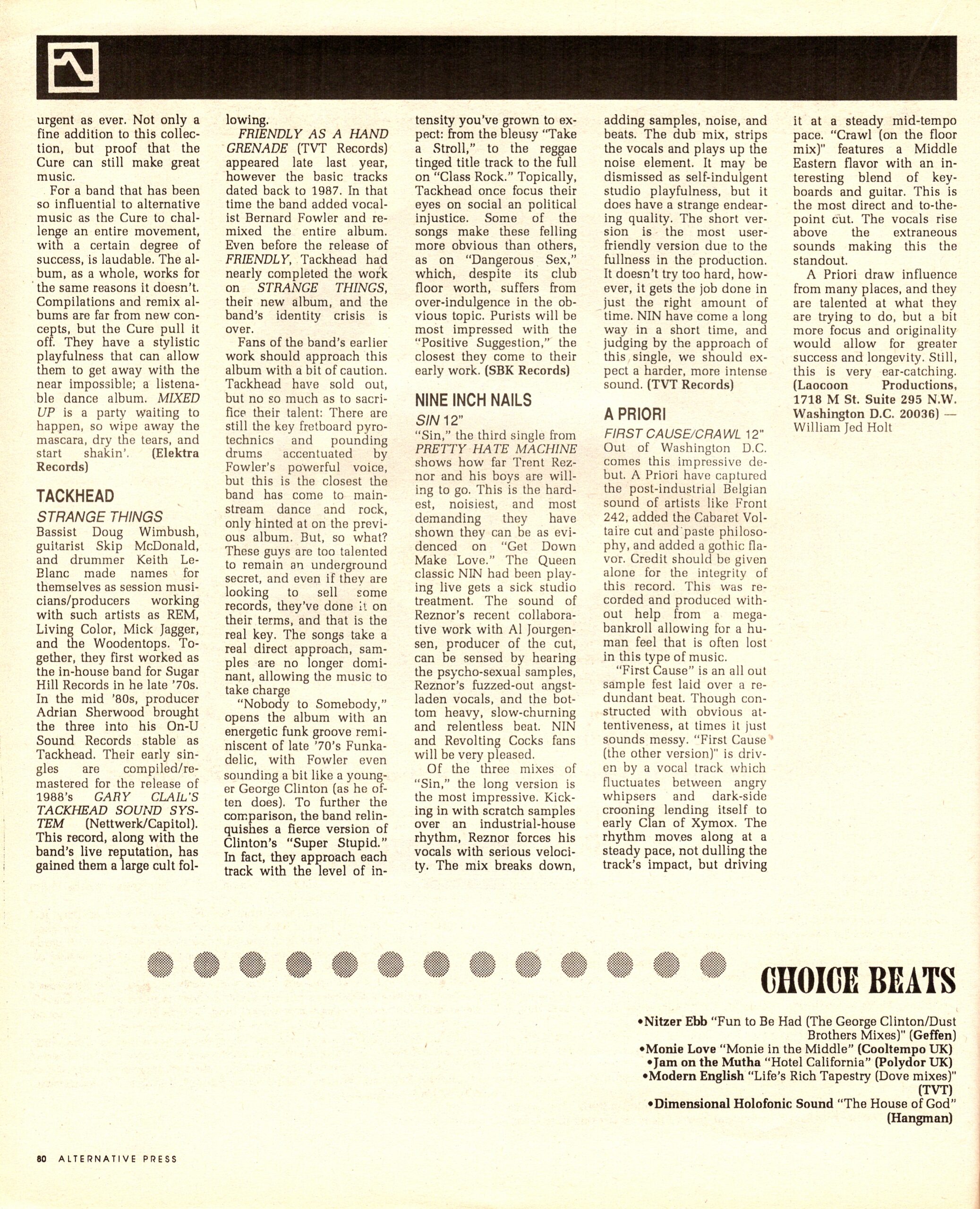 After the show, William Tucker (of the SCORNFLAKES) holds a REVCO party at Pyramid. Unfortunately, we get there too early (a rare event in NYC, I gather) and the management won’t let us inside because of a “girl bar” night. This pisses off Al so he goes to another bar and runs up a tab on Wax Trax prez Jim Nash’s American Express account. It’s tough to be a pop star.