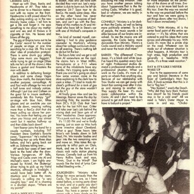 CONNELLY: “MiNiSTRY is a lot darker than the COCKS, as well as being more politically oriented. To a lot of people, the music sounds a lot alike because all our brains are involved. To me the musics are still separate, the COCKS being more danceable than MiNiSTRY. There’s a COCKS sound and a MiNiSTRY sound and never the twain shall meet.”