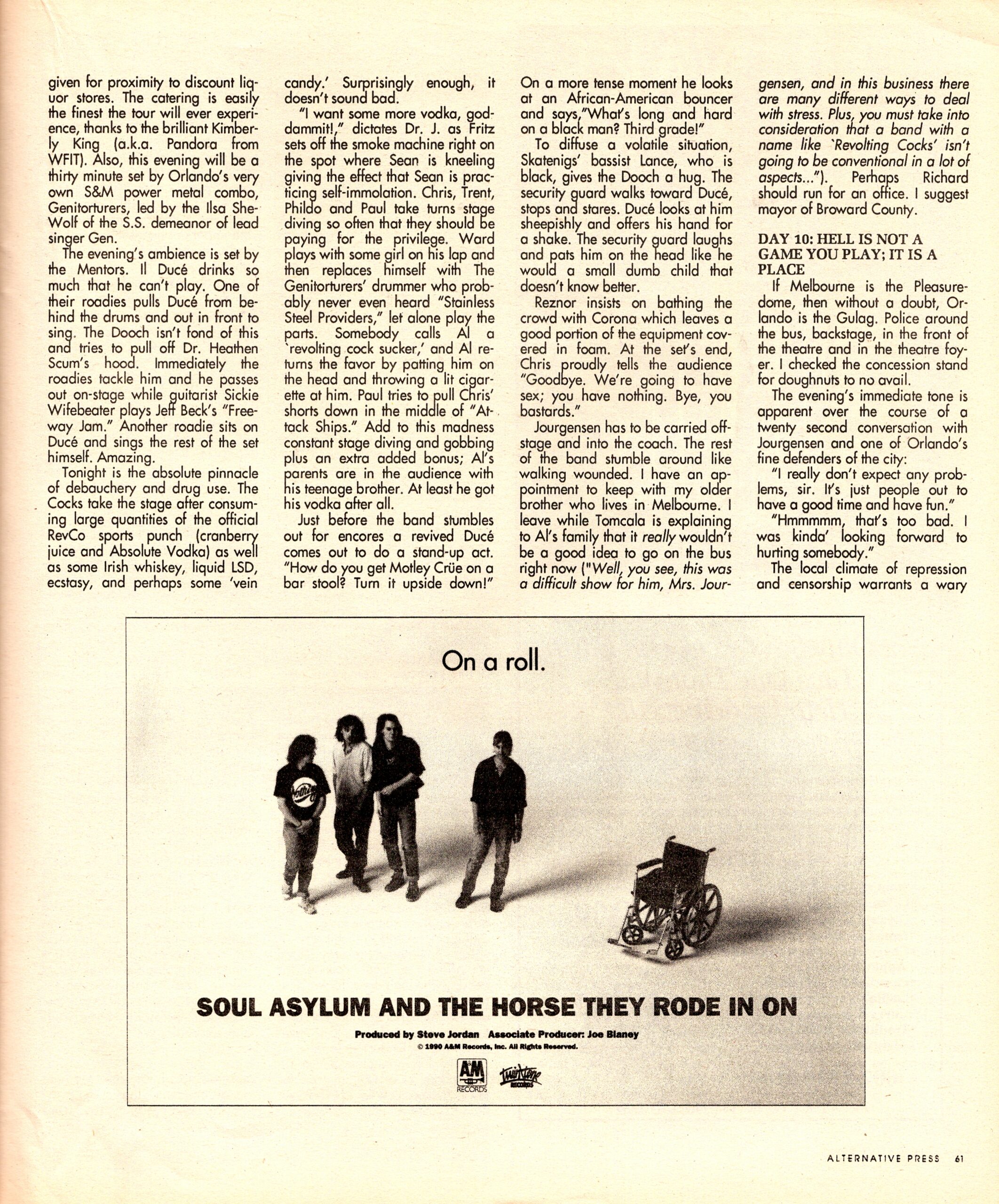 Jourgensen has to be carried offstage and into the coach. The rest of the band stumble around like walking wounded. I have an appointment to keep with my older brother who lives in Melbourne. I leave while Tomcala is explaining to Al’s family that it really wouldn’t be a good idea to go on the bus right now. (“Well, you see, this was a difficult show for him, Mrs. Jourgensen, and in this business there are many different ways to deal with stress. Plus, you must take into consideration that a band with a name like ‘REVOLTiNG COCKS’ isn’t going to be conventional in a lot of aspects…”). Perhaps Richard should run for an office. I suggest mayor of Broward County.
